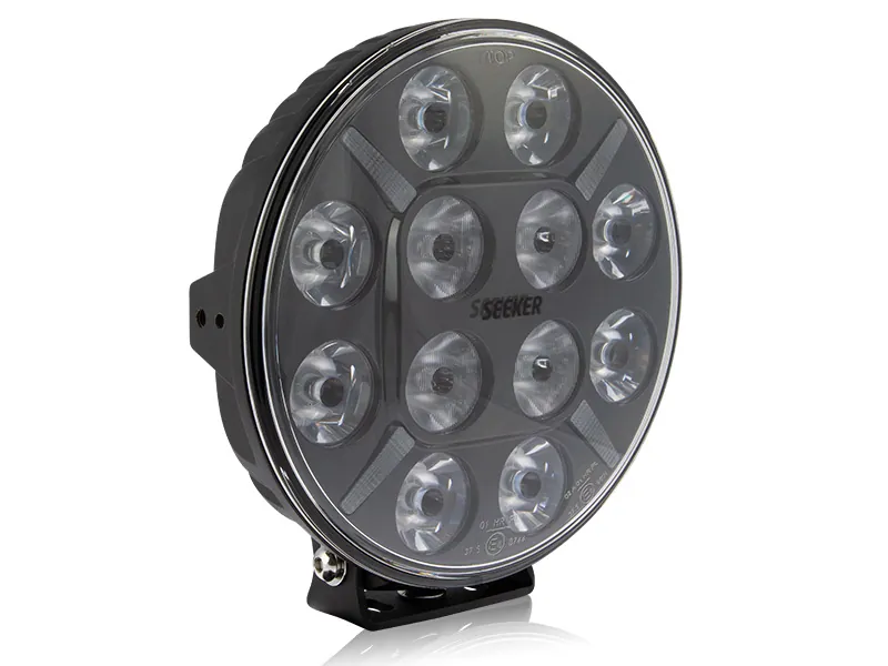 SEEKER 9 SPOT er en professionel LED fjernlyslygte med imponerende 12000 lumen og 120W effekt. Udstyret med 12 stk. 10W Cree-LED chips leverer denne arbejdslampe exceptionel lysydelse på op til 8400 lumen målt i praksis. Det kompakte design på ø220mm gør den ideel til montering på køretøjer, maskiner og udstyr, hvor du har brug for kraftig belysning. Med et bredt spændingsområde på 9-36V passer lampen til både personbiler, lastbiler, landbrugsmaskiner og entreprenørmaskiner. Det solide aluminiumshus sikrer effektiv varmespredning og lang levetid, mens IP68-klassificering garanterer fuld beskyttelse mod vand og støv. Lampen er godkendt efter R112/R7/R10 standarder og leveres med 3 års garanti. Den klare parkeringslysfunktion giver ekstra synlighed og sikkerhed. Farvetemperaturen på 6500K giver et klart, dagslysagtigt lys, perfekt til natkørsel og arbejde i mørke.