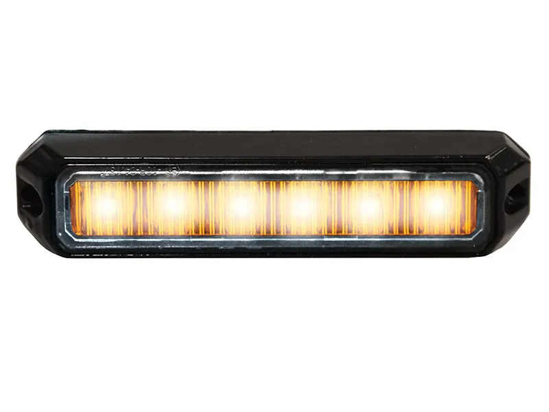 Kompakt orange stroboskoplys fra STRANDS med 6 kraftige LED'er (3W hver) og hele 26 forskellige blinkmønstre. Dette mini stroboskoplys er perfekt til erhvervskøretøjer, vejhjælp, landbrugsmaskiner og servicevirksomheder, der har brug for øget synlighed i trafikken. Med sit lave, diskrete design på kun 128x28x19mm monteres det nemt på taget eller andre flader. Leveres med 2,5 meter kabel, så du har god fleksibilitet ved montering. Stroboskopet fungerer med både 12V og 24V systemer (9-30V), hvilket gør det universelt til de fleste køretøjer. Robust polycarbonat-linse sikrer holdbarhed mod vejrlig og stød. Godkendt efter ECE R65 class 2 og ECE R10, så du kan bruge den lovligt som advarselslys på offentlig vej. 3 års garanti giver dig tryghed ved købet.